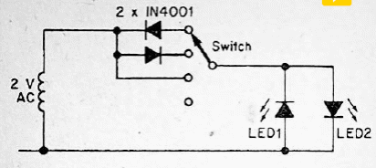 We have already presented this circuit elsewhere on our website. This version of an English documentation does not use a limiting resistor given the low AC input voltage. For more than 2 V it is important to connect a resistor from 47 ohms to 1k in series with the LEDs.