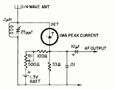 We found this circuit in the November 1952 Radio Electronics magazine. The circuit provides an audio output for amplifier stages. Other ranges can be tuned by switching the resonant circuit.