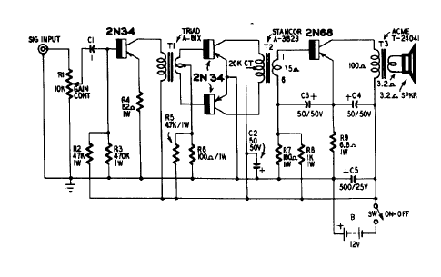 This circuit is from an American publication from the 60's. The power is on the order of 600 mW. The coupling between the steps is done by a transformer.