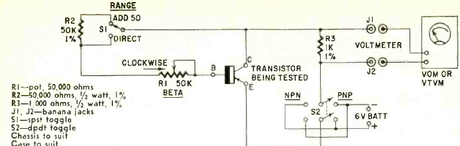 We had found this circuit in a January 1961 Radio Electronics Magazine. Using it is possible to take measures from the gain of transistor with a common a multimeter.