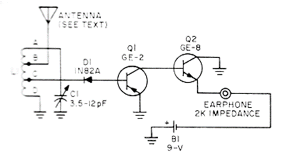 This circuit is from an Elementary Electronics from 1977. It can be assembled with relative ease by replacing Q2 with a BF494. Q1 can be replaced by any BC548; The earpiece must be a high-impedance magnetic earpiece or a piezoelectric earpiece in parallel with a resistor. L1 consists of 2 or 3 turns of 26 wire in a diameter of 1 cm without a core with taps on the turns. The circuit is not very sensitive, only picking up the strongest nearby stations. The antenna is telescopic.