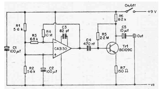 Using a CA3130 operational amplifier, this circuit was found in an English publication from 1977. The circuit does not need a symmetric power source and the transistor can be BC548.
