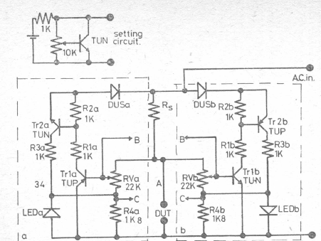 This diode tester was found in an English publication from the 1980s. Transistors are general-purpose types of the time.