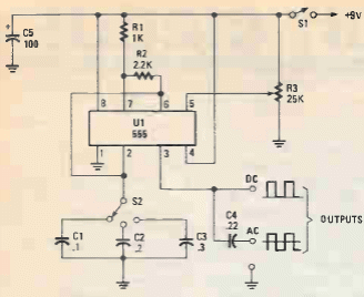 This oscillator with different outputs has frequencies selected by the S2 switch in 3 bands. We found it in a Popular Electronics from 1992.