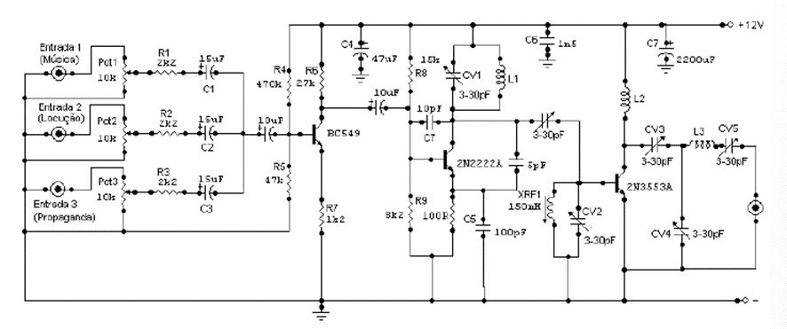 This circuit was sent by our collaborator Adriano Muniz Moura from Pirapora – PG. The transmitter presented above has a power of approximately 1.5Watts that can send its signals tens of kilometers if using a well-sized external antenna. The transistors must have good heat sinks, especially the 2N3553 transistor, which must be adjusted to its maximum power. The power supply must have good filtering and a current of approximately 5A. Potentiometers P1, P2 and P3 are used to adjust the signal level that will be delivered to the 2N2222A oscillator transistor, which can also be replaced by the 2N2218A. The coils are made as follows: L1 is made up of 7 turns of 18-wire with an 8mm diameter without a core.