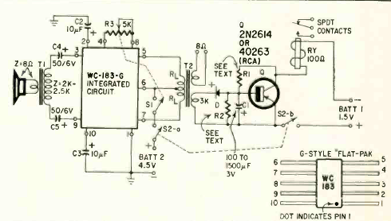 This circuit already uses an integrated circuit from the time. Note the different encapsulation of the component used. The project was published in Radio Electronics in June 1967. Power is supplied by batteries.