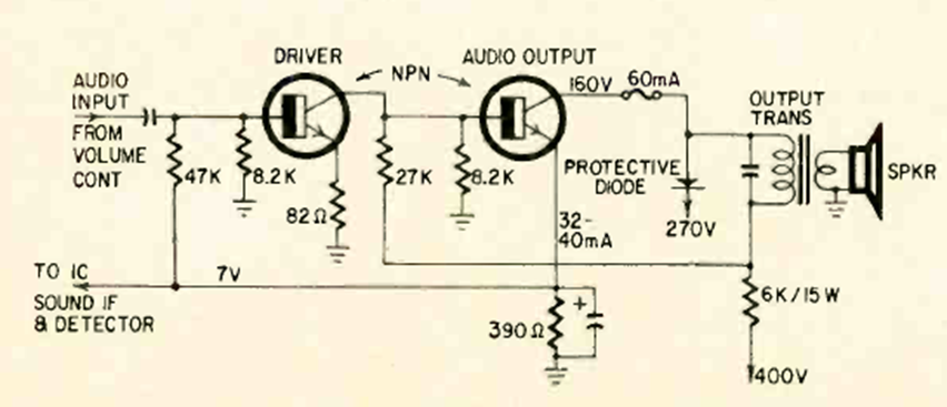 This is the typical audio amplifier for a 1967 television. We found it in a magazine from the time. Note the use of the output transformer and the high supply voltage. The circuit is an RCA CTC21.
