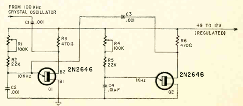 This unijunction transistor circuit is a frequency divider synchronized to 100 kHz. The circuit was found in a Radio Electronics from July 1968. The adjustment of R4 is important.