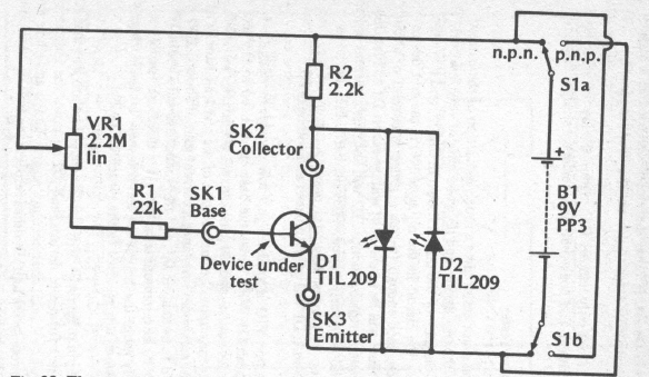 We found this circuit in an English publication from the 80's. The circuit is perfectly current, serving for testing general purpose and medium power NPN and PNP transistors.