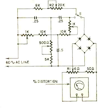 This interesting circuit measures the distortion of the sinusoidal voltage of the power grid. We found it in a Radio Electronics from August 1959. The circuit uses an analog indicator or multimeter.