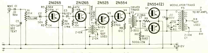 This transmitter modulator amplifier for the 11-meter band (CB) was published in Radio Electronics magazine in November 1961. The circuit is for use in a car transmitter.