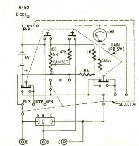 This test, the commercial transistor tester, had its diagram published in an article in Radio Electronics magazine in March 1958. The circuit uses a 3 mA indicator and 6 V battery.