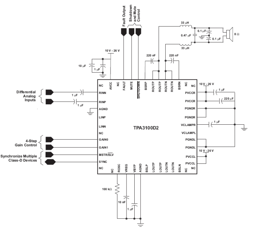The TPA3100D2 integrated circuit from Texas Instruments (www.ti.com) consists of an efficient class D amplifier with 8-ohm output, suitable for home sound equipment. The high-efficiency circuit can use 8-ohm speakers and can be supplied with voltages from 10 V to 26 V. The efficiency reaches 92% and it has gain selection and differential inputs. The TPA31002 integrated circuit can be found in 48-pin QFN or HTQFP surface-mount housings. With the high gain presented, the integrated circuit eliminates the use of heat sinks. Gains can be selected between values of 20,26, 32 and 36 db.