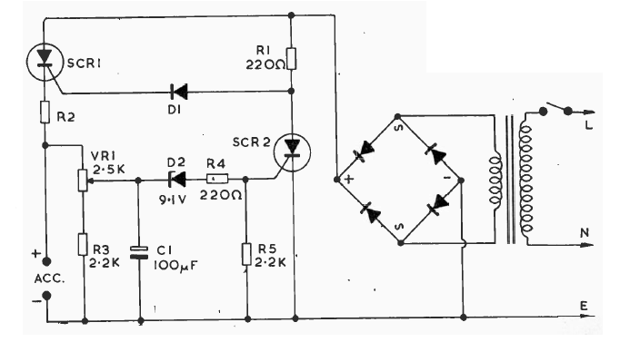 This loader has configuration already explored in other articles on the site. This is from an old English publication. The SCRs can be the TIC106, and the transformer has a secondary of 12 V x 5 A.