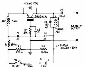 This 4.5 MHz oscillator, or according to the crystal, was found in American documentation from the 60's. The transistor is germanium of the time and the resonant circuit must be according to the frequency.