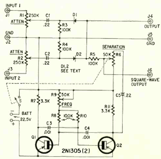 With this circuit it is possible to observe two low frequency signals at the same time on the screen of a single channel oscilloscope. The circuit is from an August 1966 Radio Electronics magazine.