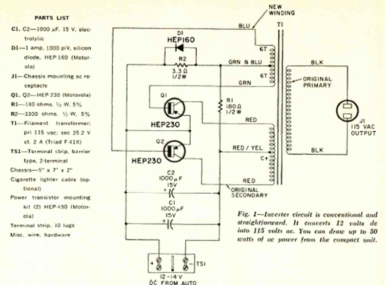 This circuit supplies 115 VAC (not perfectly sinusoidal) from a car battery. The circuit is from a Radio Electronics from December 1968.