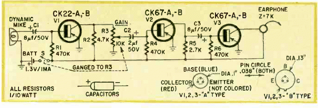 This circuit that can be assembled in an “aspirin box” was found in the Radio Electronics magazine of January 1953. It uses a magnetic earphone and is powered by a single 1.3 V battery.