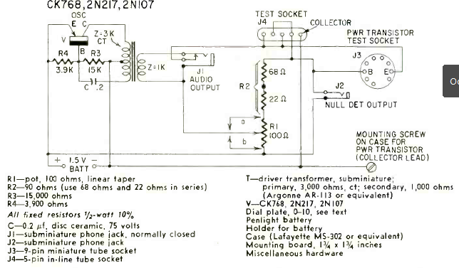 This transistor gain test was published in Radio Electronics magazine in July 1959. The transformer used is a special type common at the time. The circuit tests general-purpose transistors.