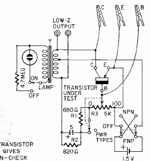 We found this circuit in Radio Electronics magazine from April 1960. It works for both NPN and PNP general purpose transistors. It is powered by a single battery and indicated by a neon lamp.