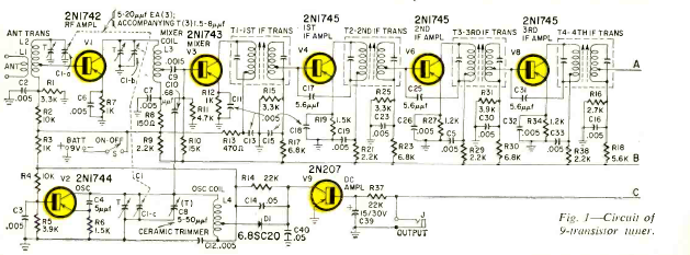 An article in Radio Electronics magazine from September 1962 teaches how to assemble this super heterodyne tuner. The 7-transistor circuit has excellent sensitivity.