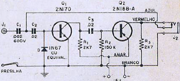 This circuit was found in a 1965 magazine. The circuit is powered by a single battery and uses germanium transistors. The earphone must be a high impedance Crystal type.
