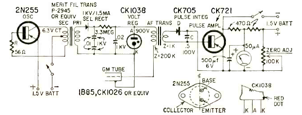 This pulse integrator was found in Radio Electronics magazine from November 1960. The components are from the time, especially the integrating diode.