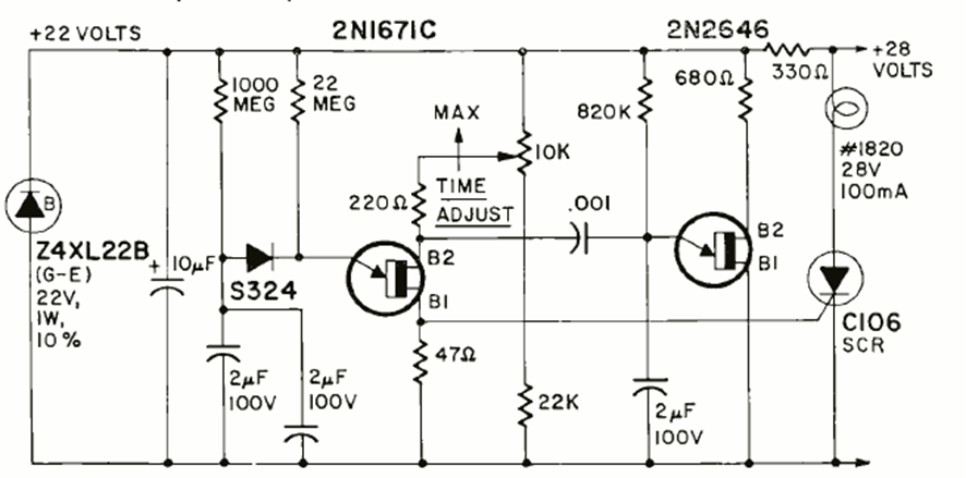 This circuit turns on a lamp after the time set on the potentiometer. The circuit is from a Radio Electronics from August 1969. The time depends on the 2 uF capacitors which, for greater precision, are not electrolytic.