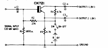 Used in audio circuits in the excitation of output stages, this circuit provides audio signals with opposite phases. The transistor is germanium and the circuit from the 60s.