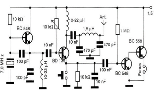 Here we have a transceiver for the amateur radio range, which operates in the 40 m band (7 MHz), depending on the crystal used (figure 4). The components are not critical, however, those in the tank circuit (those connected to the BD139 collector) are the only ones with critical values, as they will suppress harmonics during transmission. The headset is of the common type, as are the other components, without further comment. The oscillator is of the Colpitts type, controlled by crystal. Other frequencies can be experimented with, as long as the crystal and tank circuit components are changed. For example, for the 80 m (3.58 MHz) band, instead of the 470 pF capacitors, 820 pF values are placed and the 1.5 µH inductor is replaced by a 2.2 µH one. The trimpot connected to the base of the BD139 serves to control its polarization, increasing the signal at the output, which must have an adequate load (antenna, or maximum brightness on the lamp for adjustments) of 50 ohms. The phone and the manipulator can be connected using jacks. The power achieved with this circuit is around 20 mW, even powered by a simple battery. By releasing the manipulator, the circuit is enabled to receive signals and, when the manipulator is pressed, the circuit starts transmitting the signals. This circuit arrangement is little known to most readers and was based on a famous Internet circuit, the so-called "PIXIE2 transceiver". There are a multitude of websites showing this fabulous circuit, which is extremely simple and works very well. Obviously, it is necessary to use a suitable antenna, the kind used by radio amateurs. The only component that is most difficult to find commercially is precisely the crystal, with a few possibilities: having the crystal cut to the desired frequency or purchasing one ready-made commercially (7.121222 MHz).