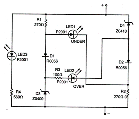This circuit is from old technical documentation, used to monitor the voltage of a 12 V battery. The circuit uses 6.8 V (D3) and 7.5 V (D4) zeners. The remaining diodes are common, and the LEDs are of different colors. The circuit indicates that a battery with more than 3.6 V is charged. The circuit can be modified to monitor other voltage ranges.