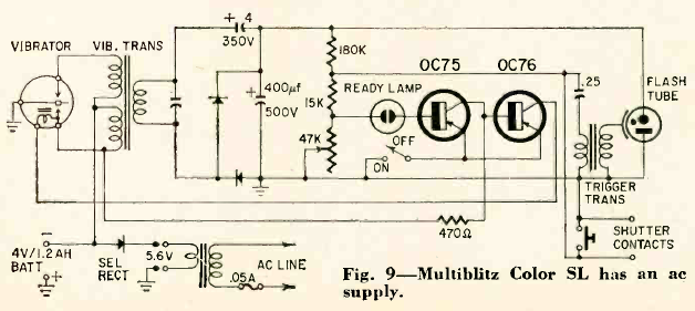This is the circuit of a commercial flash from the 60’s. The circuit was published by the march 1961 Radio Electronics Magazine. A voltage converter transformer was used to reach the voltage of the lamp.