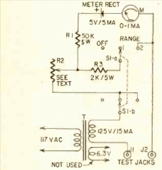 Measuring capacitances and resistance this simple instrument was found in Radio Electronics magazine from September 1958. It uses a 1 mA full scale analog instrument.