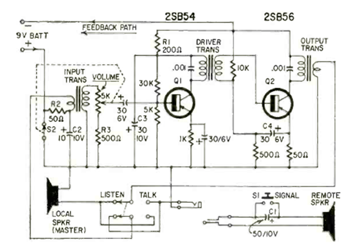 This wired intercom circuit was found in a March 1965 Radio Electronics. The circuit uses two transistors and the maximum distance between stations depends on the loss in the wires. Cables do not need to be shielded.