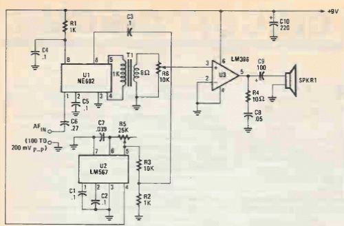We found this circuit in a Popular Electronics from 1992. It consists of a voice scrambler used in telephone transmissions.