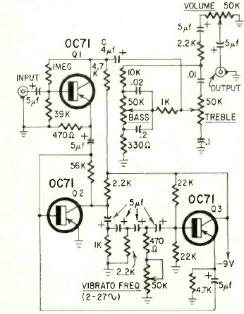 This 3-transistor circuit is from a Radio Electronics magazine from May 1963. The transistors used are germanium types of the time. The transistor has several settings.