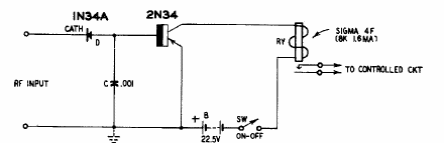 Found in an American publication from the 1960s, this circuit triggers with RF signals. The relay is according to the power supply. The circuit operates up to 40 MHz.