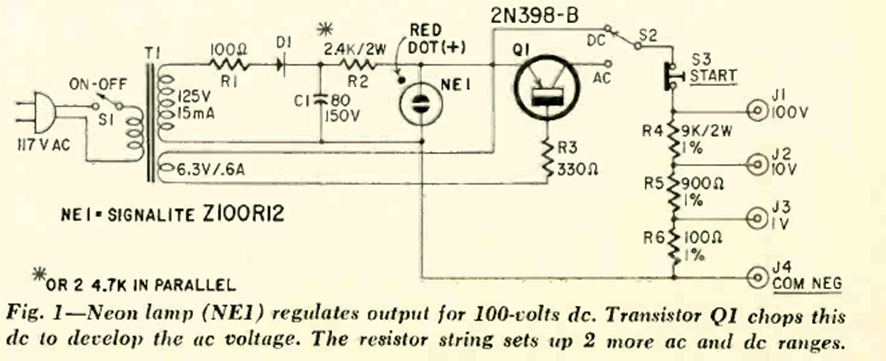 This interesting circuit with a neon lamp and a transistor was found in Radio Electronics magazine from February 1968. The transistor is a special type of high voltage at the time.