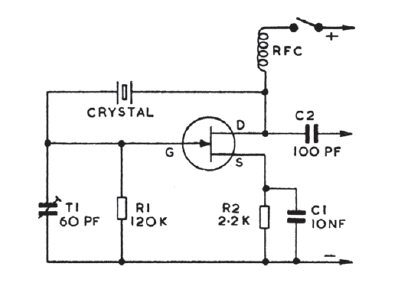 This circuit can oscillate at frequencies up to a few tens of megahertz depending on the crystal. The transistor can be any general purpose JFET.