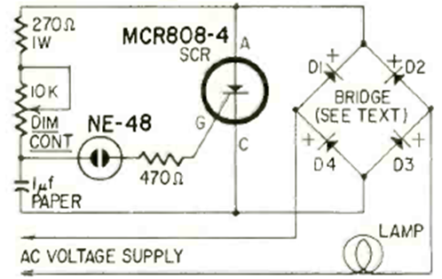 This circuit is from a Radio Electronics from June 1964. The bridge diodes must be in accordance with the power of the lamp that is controlled. The SCR must be equipped with a heat sink.