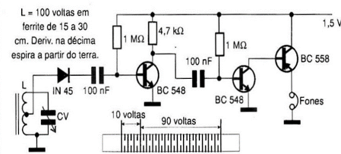 The circuit presented is a receiver for the medium wave band. Again, the components are all common, the coil consists of 100 turns of very thin wire, wound on a ferrite rod measuring around 10 to 30 cm, with a socket on its tenth turn. Carefully observe the variable capacitor and coil connections in the circuit. Tests can be carried out by moving the lead socket upwards, to improve sensitivity, however this worsens selectivity, but can be done according to the reader's needs. If necessary, it is possible to add an antenna, using a capacitor of around 10 to 100 pF on the hundredth turn of the coil, that is, on the side opposite to ground. In this circuit, the ground wire is not necessary, but in certain cases, it improves reception. A headset or even a small speaker can be used, depending on the case. The germanium diode accepts several equivalentes.