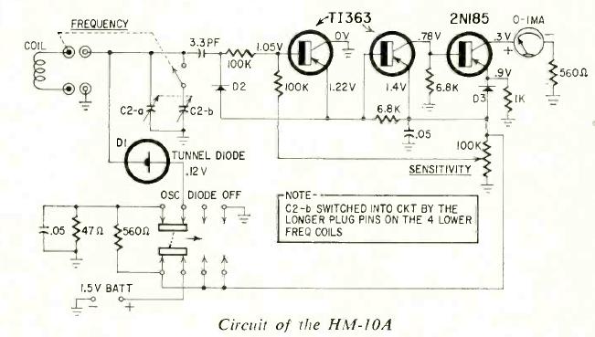 This is the circuit for the HM-10ª, an instrument sold by Heathkit. The circuit is from a Radio Electronics from May 1963. The indication is by an analog instrument.