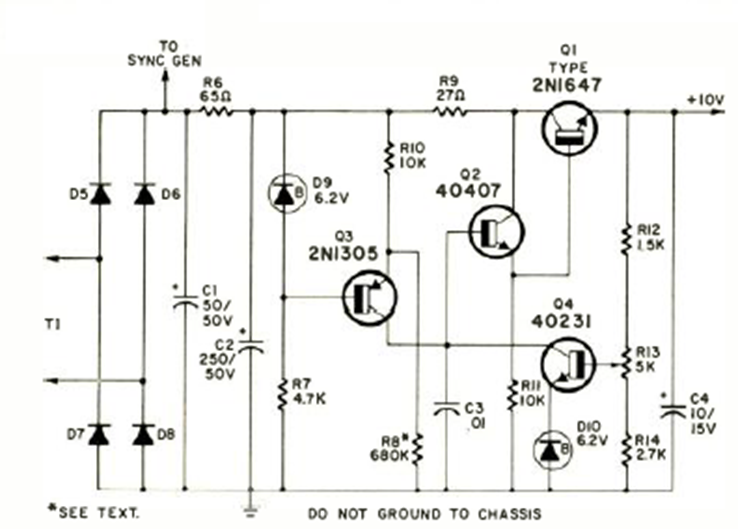 Described in the December 1969 Radio Electronics magazine, this circuit is intended to supply the previous circuit. The circuit is not isolated from the power grid.