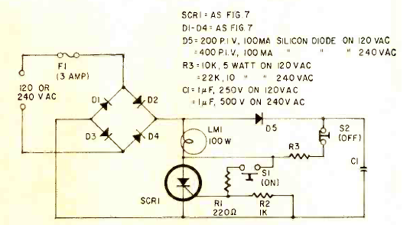 This circuit for the power grid was found in the June 1969 Radio Electronics magazine. The SCR and diodes are rated according to the power of the controlled load.