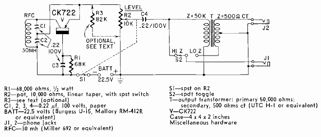 This circuit is from a Radio Electronics from March 1960. The generator works with a 22.5 V battery, generating good intensity signals determined by the LC circuit.