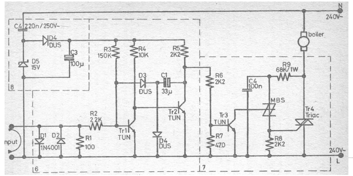 Found in an old English publication, this circuit applies to the 240 V network, but can be changed to lower voltages. Transistors are mostly general-purpose, admitting modern equivalents.