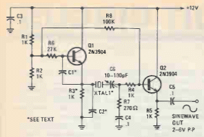 Found in Popular Electronics in 1992, this circuit can generate signals up to a few tens of Megahertz, depending on the crystal. Transistors support equivalents.