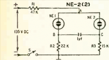 This is a basic flip flop circuit with neon lights. We found it in a Radio Electronics magazine from June 1959. Note the minimum supply voltage.