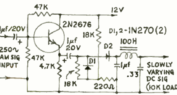 The purpose of this circuit is to detect audio that amplitude modulates an RF carrier. The circuit is for low frequency carriers. We found it in a Radio Electronics from May 1967.