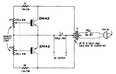 This interesting adjustable power supply uses the transistors themselves as controllers and rectifiers. The circuit is from the 60s, and the transistors are from the time.